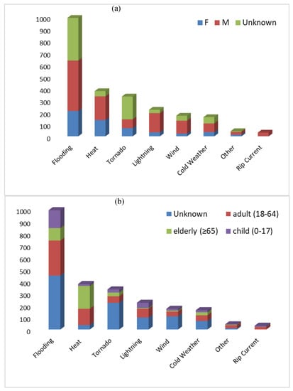 The gender of the victim was provided in 69% of the reported fatalities. Among those, males made up 68% and females 32% representing an approximate ratio of 9:5. This gender disparity has also been observed in other research, for example in flood-related fatalities [,,,] and in lightning-related fatalities [,,,]. In all cases there was a high male to female ratio of fatalities. For the current study, the ratio of male to female fatalities is approximately 2:1. The greatest disparity was found in wind and lightning fatalities that show a 5:1 ratio of male to female fatalities. Rip currents have only been tracked since 1998 but the data thus far indicates a 30:1 ratio of male to female fatalities.