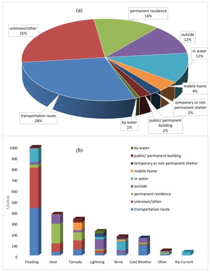 Hydrometeorological disaster fatalities classified (a) by reported location of occurrence and (b) by disaster type and location