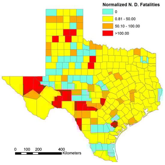 For example, Loving County has the highest normalized fatality rate (> 4000 per 100,000) in the state due to its small and stagnant population and the fact that the county experienced several multi-fatality events of wind and hailstorm that struck the Red Bluff Lake area killing four persons by drowning when their boat capsized in the lake during a squall. Similarly, on 11 June 1965, the city of Sanderson in Terrell county was devastated by a flash flood. As noted by the Texas State Historical Association, “A wall of water washed down Sanderson Canyon into Sanderson, destroying numerous homes and businesses. Twenty-six people died in the flood. Eleven flood-control dams were constructed to protect Sanderson against another such catastrophe” []. The town had a population of 1500 in 1980 and 1128 in 1990. Reduction of fatality risk in these rural counties will require an increase in awareness through weather-related emergency educational programs and resource assistance (financial and physical) to implement safety systems.