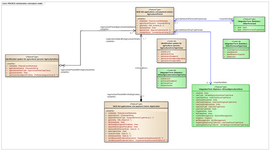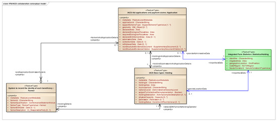 Even though the relationship between Statistical Holding and Holding brings all properties of Application and Farmer too, for the sake of emphasizing the connection between the Application and the StatisticalHolding, a relationship was created between them too. Such redundancy is allowed at a conceptual level. The collaboration of the StatisticalHolding feature type with the elements of the IACS is shown in Figure 4.