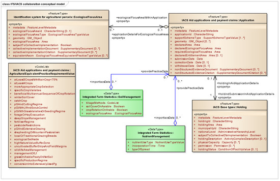 In order to deal with the specificities of spatial information out of the totality of the IFS requirements, this paper selected only those that directly deal with geographic location (e.g., utilised agricultural area), or that can be derived from georeferenced information stored in IACS (e.g., area values, crop types, or agricultural practices). Having translated the requirements of the IFS into technical concepts, a class diagram was then developed in Unified Modelling Language (UML).