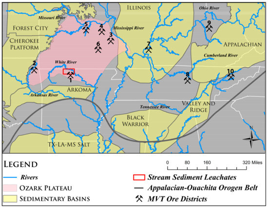 The current results suggest that the mineralized area, which is drained by the White River and its tributaries, is the major source of metals in the stream sediments. To determine whether the MVT ores from the southern Ozark region are the main contributor of Pb to the stream sediments, the Pb isotope ratios of the analyzed leachates have been compared to the available Pb isotope values of ores from the Northern Arkansas, Tri-State, Southeast Missouri, and Central Missouri mining districts.
