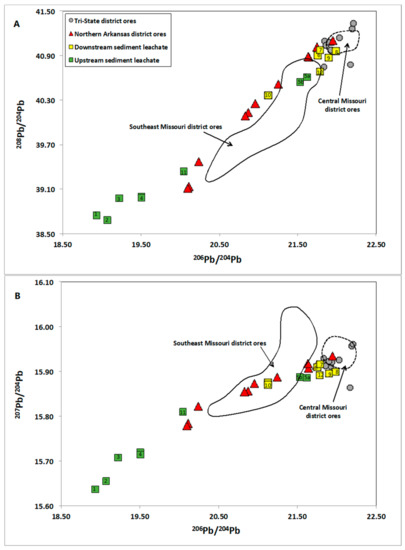 Measured 208Pb/204Pb vs. 206Pb/204Pb (A) and 207Pb/204Pb vs. 206Pb/204Pb (B) of extractable Pb in stream sediments from the White River and tributaries, superimposed on previously published data [28,29] of ore samples from the Tri-State, Northern Arkansas, Southeast Missouri, and Central Missouri MVT districts. The numbers inside the symbols indicate the sample ID (the “NA” has been omitted for clarity purposes).