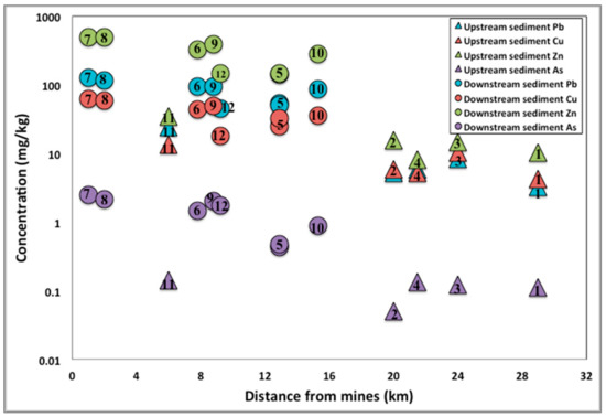 - Overall, the Pb, Cu, Zn, and As concentrations in the analyzed samples are directly correlated with their proximity to the mines. The samples that were collected closest to the mines have trace element concentrations that are well above those in soils from the surrounding areas. The lowest toxic element concentrations are noticed in samples collected upstream of the mines, reaching levels that were well below the average concentrations in soil.