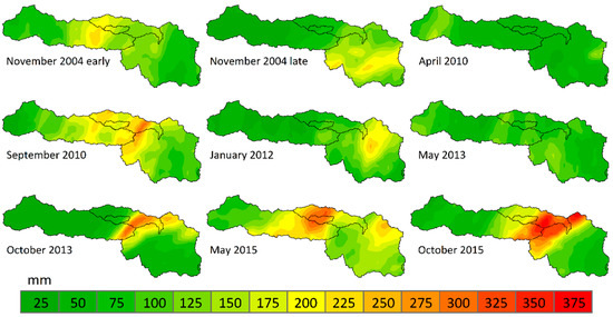 Here, nine large precipitation events from 2004–2015 across the middle Guadalupe basin were selected to examine satellite precipitation estimate performance and hydrologic model error propagation. All of the storm event accumulations from the Stage IV precipitation record are presented in Figure 2. The hydrometeorology of several of these events has been examined in detail including Furl, Sharif [42] (May 2015 event), Furl, Sharif [40] (September 2010 event), and Sharif, Sparks [36] (November 2004 events).