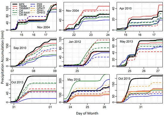 Storm event rainfall accumulations averaged over the Blanco watershed. Legend labels are abbreviated as follows: MPE—Stage IV, TRMM—TRMM 3B42, CM—CMORPH CDR, GPM F—GPM IMERG FINAL, CM 8K—CMORPH 8KM, PER C—PERSIANN CCS, GPM E—GPM IMERG EARLY, GPM L—GPM IMERG LATE, CM RAW—CMORPH RAW, TRMM-RT—TRMM-RT 3B42, and PER—PERSIANN.