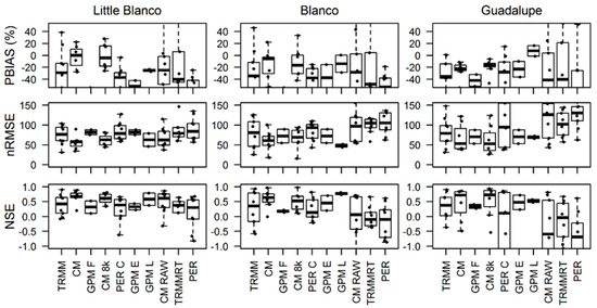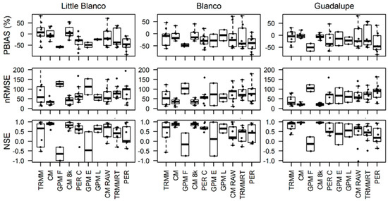 The performance of the precipitation products in the simulated hydrograph followed a similar pattern as described in the precipitation analysis. However, the variability of the products seems to increase as the scale of the watershed increases. Boxplot results showing performance statistics at each of the three basins are displayed in Figure 7. The CMORPH product (labeled as CM) showed higher Nash coefficient in Little Blanco (the smallest basin) but as the size of the watershed increased, the performance was seen to plummet. A similar pattern was observed in most the products when moving from Little Blanco to Guadalupe. All evaluation criteria showed a very wide range and high variability and error magnitude in the case of the Guadalupe Basin (Figure 7). The accumulated effect of all the discrepancies in the products across the watershed caused a significant increase in variability at the outlet. However, the increase in spatial domain of the watershed improved the performance of the GPM Late product across all the criteria.