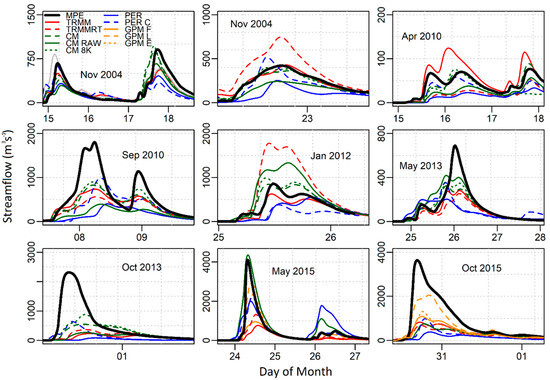 Streamflow hydrographs at the Blanco watershed outlet. Legend labels are abbreviated as follows: MPE—Stage IV, TRMM—TRMM 3B42, CM—CMORPH CDR, GPM F—GPM IMERG FINAL, CM 8K—CMORPH 8KM, PER C—PERSIANN CCS, GPM E—GPM IMERG EARLY, GPM L—GPM IMERG LATE, CM RAW—CMORPH RAW, TRMM-RT—TRMM-RT 3B42, and PER—PERSIANN.