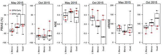 The two largest rain events from the dataset occurred in May and October of 2015, and both resulted in significant flash flood events along the Blanco River [42]. These events were captured by GPM and offer an initial look at GPM performance for short duration high magnitude storms. Figure 5 shows performance statistic results for each of the real-time products (PERSIANN, PERSIANN-CCS, TRMM-RT, and CMORPH RAW) along with the Early and Late GPM runs. Generally, the GPM products performed better than did the other real-time satellite products. For the May 2015 event, the Early product produced better estimates than the Late run, with the opposite pattern for the October 2015 event. Gauge corrected estimates (Table 3) showed a significant underestimation of the events, which is not surprising given it is adjusted to monthly values. The Early GPM product failed to capture the storm event of October 2015 showed by the negative value of Nash coefficient (Figure 5).