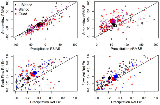 Annual Error propagations descriptions comparing streamflow and precipitation percent bias (PBIAS) and normalized root-mean-square-error (nRMSE) (top left and top right, respectively) and relative error in precipitation versus peak flow relative error (bottom left) and streamflow volume relative error (bottom right) N.B. the big markers represent the mean value.