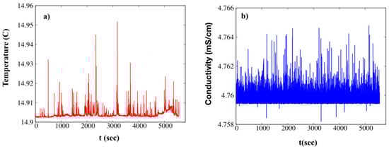 The time series (summer 2010) of (a) temperature and (b) conductivity. Notice that conductivity changes are very small and present a regularity; instead, temperature variations are a bit larger and possess some irregular peaks.
