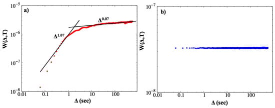 The variance of temperature is formed by two discrete regimes (left panel in Figure 3), with a turning point at . We fit the variance of temperature with a function of the form, . For the first regime, , we found that , and for the second regime, the value of the exponent was . In the first regime, the obtained value of 1.073 indicates a process that potentially can be characterized as Brownian, since . However, the form of the structure function (Figure 4) does not support this hypothesis (see also the discussion in []) and reveals information useful for characterizing the system, as closed or open, i.e., a bowl-shaped caldera vs. a caldera with no large difference between its rim and its bottom, respectively. In the second regime, the estimated exponent showed clearly a stationary process, suggesting that all measurements which were at least 1 s apart shared the same properties.