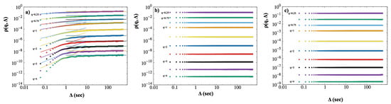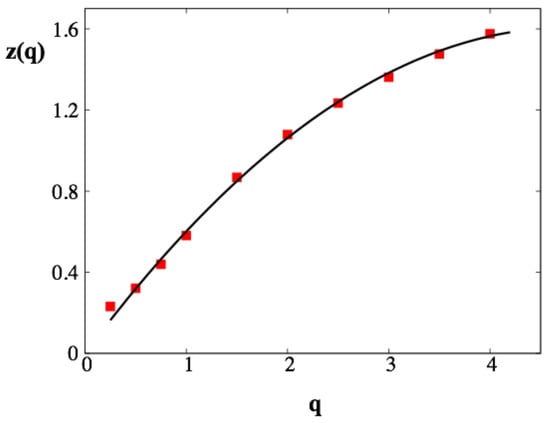 where even fractional values of the moment, q, are taken into account. We use only positive values of the moments []. The values of the moments in the range are responsible for the core of the probability density function (pdf), while moments higher than 2, , contribute to the tails of the pdf.
