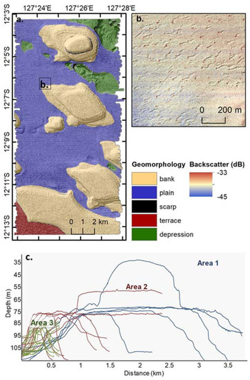 The data presented herein were collected during the Oceanic Shoals environmental marine survey (SOL5650/GA0339) undertaken in September 2012 [21]. High-resolution multibeam echosounder (MBES) bathymetry and backscatter data were collected over three areas covering a total of about 425 km2 of seabed (Figure 1). MBES bathymetric data was processed using Caris Hips and SIPS v.7.1. Seabed backscatter data was processed with CMST-GA MB Process toolbox software co-developed by the Centre for Marine Science and Technology at Curtin University of Technology and Geoscience Australia [38]. Both data types were gridded at 1 m horizontal resolution for analysis and interpretation purposes.