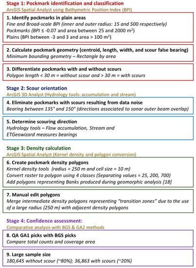 Due to their large number, manual mapping of individual pockmarks was deemed unsuitable. Therefore, an automated method (GA1) was developed to identify both pockmarks and associated scour marks. The overall approach was similar to other published automated and semi-automated methods [10,18], in which a multi-stage process was undertaken. The main stages included (1) identifying pockmarks and differentiating scoured from non-scoured pockmarks, (2) determining scour orientation, (3) calculating field density and (4) assessing confidence in the results (Figure 4). Each step of the method used an existing suite of ESRI spatial analytical tools, such as the hydrological and surface toolboxes. Details of the method can be found in the supplementary material. Density classes were used as a common unit for comparative analyses with other survey datasets.