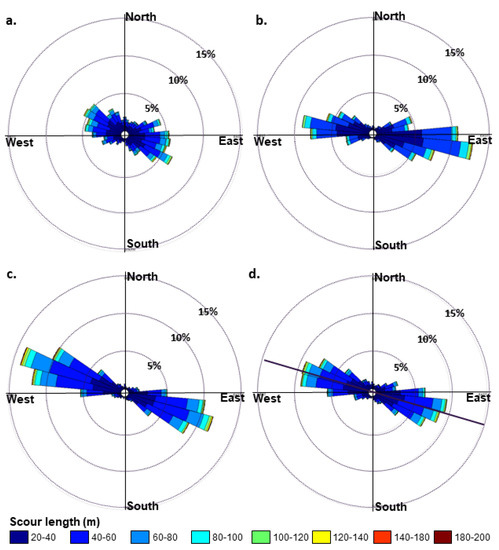 Rose diagrams of observed scour direction for each of the area analyzed. (a) Area 1; (b) Area 2; (c) Area 3; and (d) combined areas.