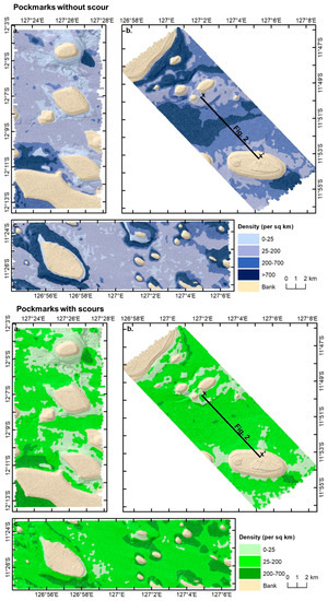 Density distribution of pockmark without scour (to; blue shades) and with scours (bottom; green shades) within the three survey areas ((a) Area 1, (b) Area 2, and (c) Area 3). The location of the sub-bottom profile presented in Figure 2d is also displayed on b. to indicate the location of the buried paleochannel within the cross-shelf valley of Area 2.