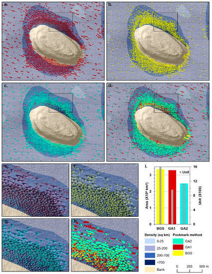 Comparison analysis between the results of GA1, GA2 and BGS methods shows that all three methods identified most pockmarks present, within 10% of each other (Figure 7). However, discrepancies exist between their pockmark total count and coverage area (Figure 7i). For example, BGS method identifies 60% more pockmarks than the GA1 method (Figure 7i), but their total coverage areas are similar. These discrepancies are attributed to GA methods often combining closely spaced pockmarks or identifying pockmark scours. For GA1 method, this resulted respectively in reducing the overall pockmark count while increasing the total coverage area (Figure 7i).