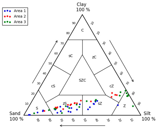 Ternary diagram illustrating the relative proportions of Sand, Silt, and Clay (after [47]) indicating the dominance of silt over clays in the muddy sediments of the Oceanic Shoals.