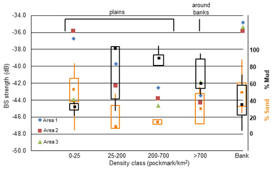 Sediment characteristics (box plots) and averaged seabed backscatter strength (coloured symbols) for each non-scoured pockmark field density class per area. Similar results were observed for the scoured pockmark.