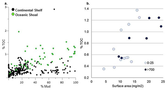 Oceanic Shoals sediments have the highest Total Organic Carbon (TOC) concentrations of sediments collected so far on the Australian continental shelf, which average 0.8% (Figure 10a, [39]). Moreover, there is a positive linear relationship between the mud content, surface area (SSA) and TOC as common for Australian Shelf sediments [48]. While most Oceanic Shoals sediments have surface area-normalised TOC concentrations that are in the typical range for the continental shelf [39], the sediments from the dense pockmark fields have less TOC per unit surface area than sediments from the low-density pockmark fields (Figure 10b).
