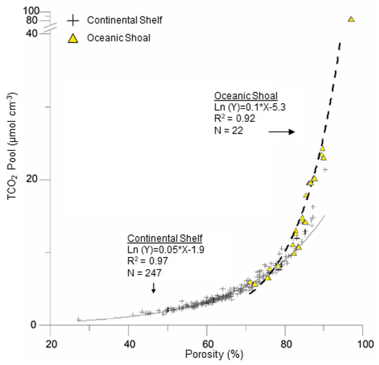 Total carbon dioxide porewater pool concentration (0–2 cm) versus porosity (0–2cm) of the samples collected on the Australian Shelf between October 2007 to May 2013 (see Table 1 in [39] for survey details). The yellow triangles pertain to pockmarked sediment in the Oceanic Shoals AMP survey areas.