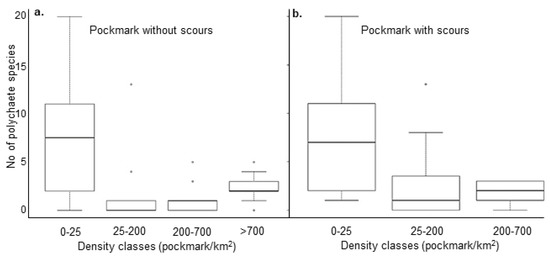 Boxplots of polychaete species richness among pockmark density classes (a) without scours and (b) with scours.