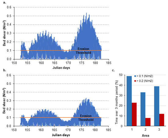 Modelled bed shear stress results for the three months period in (a) Area 1 and (b) Area 3. (c) Comparison of the percent time in the three months modelled period where the bed shear stress exceeded the erosion threshold of 0.1 N/m2 considered for the type of sediments found in the study area [49] and 0.2 N/m2.