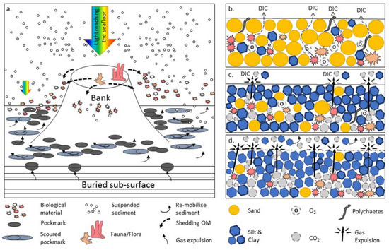 Conceptual model summarising the hypothesis about the formative processes of the pockmark fields in the study area. (a) Overview of the bank-plain system; (b) Low pockmark density scenario where more elevated sand content results in lower porosity compared to finer grain-sizes (shown here as clay and silt particles) and presumably higher permeability (interconnected pore space). Therefore, when OM is mineralised into DIC it does not build up to saturation levels for CO2. Polychaete biodiversity is relatively high because of the increase gas exchange (O2) and more stable conditions. (c) Medium pockmark density scenario where porosity is higher than (a). Permeability may become occluded within sediment micro-niches due to the occurrence of fine sediments (silt and clays) and the swelling of smectite. Limited pockmark formation occurs due to gas build up. Polychaete biodiversity is likely low due to the low O2 concentrations and increasing CO2 concentrations caused by restriction in permeability and the physical disruption to the sediments due to pockmark formation. (d) High pockmark density scenario in which sediments contain more silts and clays creating more micro-niches for gas formation. The gas is expulsed and the seafloor becomes “rugged”. Clay particles have less sediment-bound OM due to OM priming. Sediments are mobilised from pockmarks due to strong near-seabed currents. Low polychaetes biodiversity is presumably due to physical disturbance.