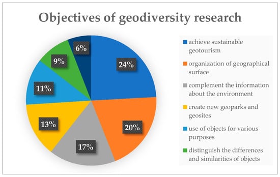 It is important to recognize why geodiversity is evaluated. Depending on the needs of geoparks or other territories, various objectives are taken into account. The chart (Figure 2) was created by the review of over 100 articles and research papers which refer to the motives of geodiversity research. The choice of individual articles was conditioned by three main criteria. First of all, the articles published in the years 2015–2018 were taken into account in order to get the most up-to-date list, however some articles were selected from 2010–2015 and the reason is the other two criteria. Second of all, the direct content of the text referring to the quantitative and qualitative geodiversity. Nevertheless, not all authors use the characteristics of both categories, therefore the author took into account the articles only with a quantitative or only qualitative value. Third of all, is diversity, which in this case testifies the origin of articles from different countries (geotourism institutions, geoparks or universities). The largest number of articles was selected from sources such as: Geoheritage, Geotourism (Geoturystyka), GeoJournal of Tourism and Geosites and Geophysical Research Abstracts (EGU, Vienna, Austria, General Assembly. The author used scientific works, which include among others: Brilha, 2016 []; Farsani et al., 2014 []; Henriques and Brilha, 2017 []; Kapera and Różycki, 2015 []; Forte et al., 2012 []; Lima et al., 2014 []; Kot and Sobiech, 2013 []; Najwer and Zwoliński, 2014 []; Reynard et al., 2016 [].