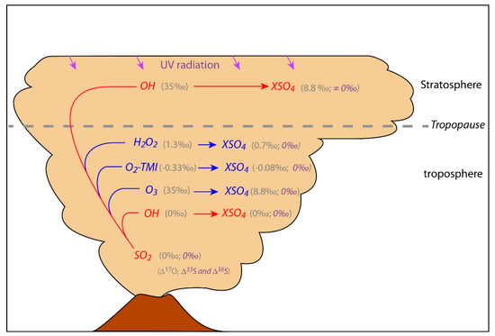 (A) The tropospheric origin of sulfates: If the O-MIF (up to 6‰) sulfates are generated in the troposphere, O3 must have played an important role (Figure 1), which seems unlikely considering acidic conditions of volcanic plumes. Furthermore, if S-MIF is also generated in the troposphere during super-eruptions, it has to be considered that the ozone layer was depleted, at least locally, such that a significant fraction of UV radiation was able to reach the troposphere, thus making SO2 photoexcitation and photolysis possible. It is noteworthy that such a process is compatible with the UV-B flux variations possibly linked to the large igneous provinces emplacements ([120,121] and reference therein).