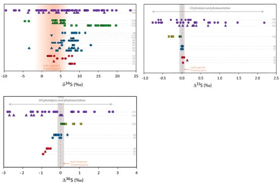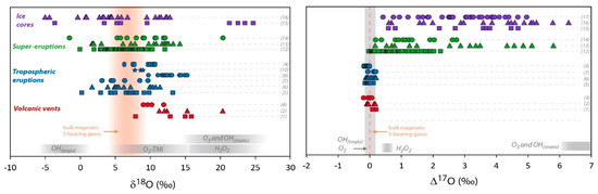 Multi O- and S-isotopic composition measured in volcanic sulfates. Red symbols represent primary sulfate samples collected at volcanic vents (aerosols or sulfate extracted from ashes). Blue symbols are sulfate samples extracted from volcanic deposits from tropospheric eruptions gathered at distances up to 100 km from the vent. Green symbols represent volcanic sulfates collected in deposits of super-eruptions at distances between 500 km and 5000 km from the volcanic systems. Pale green symbols correspond to ∆33S and ∆36S recalculated from the values represented by the dark green symbols, assuming dilution by non-volcanic sulfates [33]. Purple symbols represent sulfate samples from Antarctica ice cores. Mass dependent (non-MIF) compositions are emphasized by grey areas (taking into account the analytical uncertainties in 2σ) and bulk magmatic S-bearing gases composition by orange areas or dotted lines (see the Section 3.1 isotopic composition of S-bearing gases for further discussion). The theoretical δ18O and Δ17O composition of secondary sulfate generated in the atmosphere by different oxidation pathways are reported in grey areas. The different oxidation pathways via OH, H2O2, O3, and O2-TMI are detailed in the introduction of this paper and in Figure 1. The effect of UV photolysis and photoexcitation of SO2 on the sulfate Δ33S and Δ36S are shown by grey arrows. References of the figure: sulfate aerosols (1): [31]; (2): [30]; (3): [25] and references therein; sulfate extracted from volcanic ash (4): [30]; (5): [20]; (6): [35]; (7): [75]; (8): [76]; (9): [32]; (10): [77]; (11): [34]; (12): [33]; (13): [35]; (14): Unpublished data; (15): [78]; (16): [79,80,81]; (17): [82]. For the (16) and (17) dataset and due to significant background corrections, only samples with high volcanic fraction (>65%) are considered here (see [82] for further discussion); (18): [83]. Note that for stratospheric aerosols collected in ice cores, even if only high volcanic fraction samples are considered, the uncertainties are typically of about: Δ17O ± 0.5‰, Δ33S ± 0.1‰ and Δ36S ± 0.8‰ (in 2σ; see Figure 3).