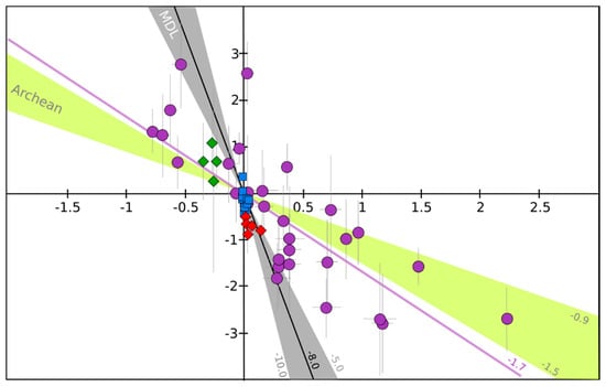 Δ33S versus Δ36S relationship for volcanic sulfates collected close the vents (in red), from volcanic deposits of tropospheric eruptions (in blue), super-eruptions (in green), and from ice cores recording stratospheric eruptions (in purple). All the dataset is the same as in the Figure 2. MDL: mass dependent fractionation line which has a slope between −10.0 and −5.0 (−6.58 in average) and Archean (yellow zone), corresponds to reference array defined by Archean rock samples, and have a slope between −1.5 and −0.9. For more details, the reader is invited to read the recent review on the subject by Ono [94]. Despite the analytical uncertainties, specifically on Δ36S from ice core sulfates samples (see the error bars in 2σ), which induce possible large uncertainties on the Δ33S/Δ36S ratios (lines) defined by volcanic samples, some general conclusion can still be addressed. Volcanic sulfates produced in volcanic vent at high temperatures and in the troposphere define a line with a slope of about −8.0 (R2 = 0.61), which is comparable to the MDL. However, volcanic sulfate from stratospheric and super-eruptions define a line with a slope of about −1.7 (R2 = 0.65), which is clearly not comparable to the MDL but very close to the Archean array.