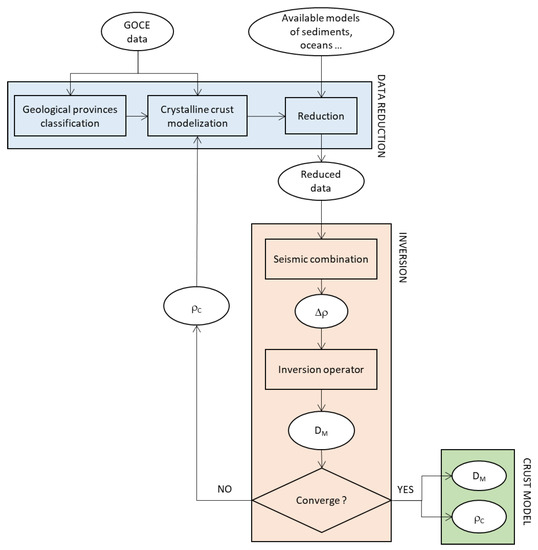 Basically, the presented processing scheme allows the user to estimate a final crustal model, which, on one hand, generates the expected gravitational field and, on the other hand, is as close as possible to the available seismic-derived Moho depths.