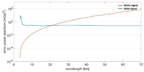 As it can be seen, for wavelengths smaller than about 20 km, the observation error (blue line) is larger than the Moho signal (red line), which implies that useful information is not retrievable, from GECO, below such a threshold.
