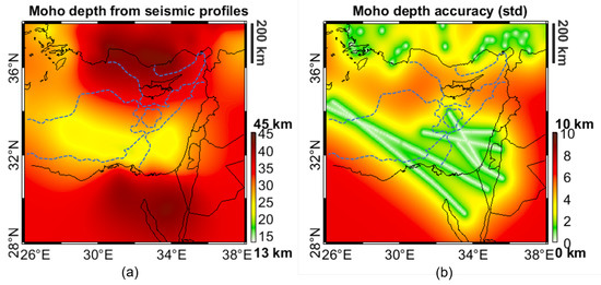53], in the considered area is not properly constrained with seismic profiles. This is confirmed also by the predicted map of the Moho depth uncertainty, which ranges between 4 and more than 8 km (STD), in the study area [