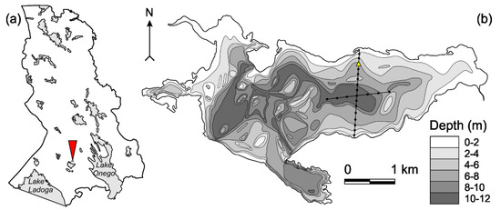 The study was conducted on Lake Vendyurskoe (62°10 N, 33°10′ E) located in southern Karelia, northwestern Russia (Figure 1). It is a small and shallow lake of glacial origin with a surface area 10.4 km2, a volume of 54.8 × 106 m3, and a maximal and average depths of 13.4 and 5.3 m, respectively). Lake Vendyurskoe has several small inflows and one outflow. The ice-period on the lake starts from early November to mid-December; icebreaking takes place from the end of April to o mid-May, so the ice-covered period ranges between 150 and 190 days [23,24]. The lake ice cover consists mainly of two layers—white ice and congelation ice. In some years, a layer of snow with water (slush) is observed between white and congelation ice [25]. Snow (up to 0.3 m) covers the ice during the main part of the winter.