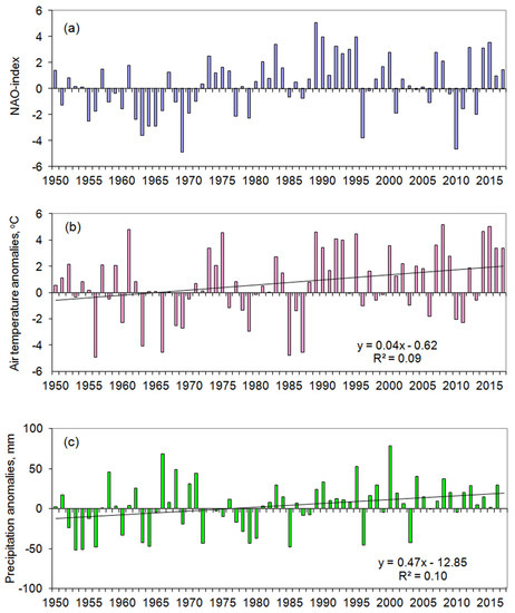 (a) North Atlantic Oscillation (NAO)-index and anomalies of average air temperature (b) and precipitation (c) for December-March for period 1950–2017 relative to the climate norm (period 1961–1990) for meteorological station Petrozavodsk. Solid lines are linear trends.