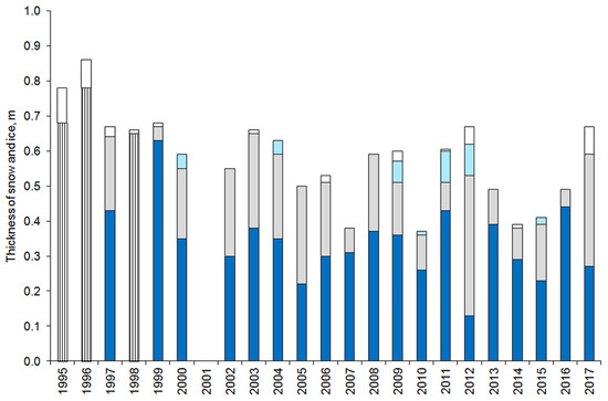 In late March—early April, the snow melted quickly with a rate of melting of 1–2 cm per day, and by mid-April the snow thickness did not exceed a few cm (Figure 3). The ice thickness averaged over all stations in mid-April varied within 0.4 to 0.8 m in different years, with congelation ice 0.25–0.57 m thick, white ice 0.10–0.27 m thick, and slush 0.03–0.09 m thick. In spring, the standard deviation of the thickness of congelation ice and snow was 1–5 cm, that of slush 1–4 cm, and that of white ice 1–8 cm. Typically, in mid-April the congelation ice was thicker than the white ice, but sometimes the thickness of the white ice was larger. An abnormally small thickness of congelation ice in 2012 (0.13–0.14 m) was a result of frequent precipitation during the first month of ice-period, which markedly increased the thickness of white ice.