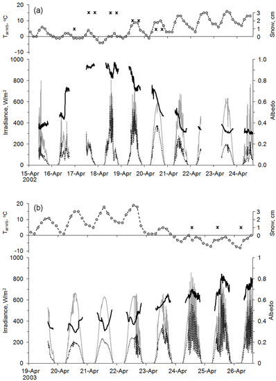 Analysis of downwelling irradiance data made it possible to reveal clear days, that is, the days when the radiation curve changed smoothly, without significant fluctuations. For example, April 20, 2002 was a clear sunny day (Figure 4a), as well as April 20 and 21, 2003 (Figure 4b). Sometimes on clear days with positive air temperature a certain correlation of albedo with SZA was observed: albedo decreased from morning hours to 2–3 p.m., then it increased up to 5–6 p.m. (Figure 5b,c, see also Figure 4a, April 23, 2002 and Figure 4b, April 20–22, 2003).