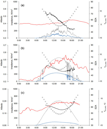 Temporal variability of downwelling (grey lines) and upwelling (blue lines) irradiance, albedo (black bold lines), solar zenith angle (circles) and air temperature near Lake Vendyurskoe (red lines) during April 22, 2006 (a), April 24, 2006 (b), and April 27, 2006 (c).
