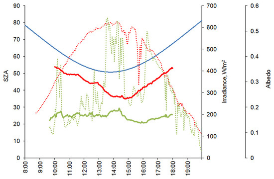 Reflective properties of the earth’s surface are an important part of its heat balance because it reduces the ability to absorb shortwave radiation [1,2]. Since the earth’s surface is very heterogeneous, its reflectivity, which is described by the concept of albedo, also varies markedly. Albedo is defined as the ratio of the reflected to the incident radiation flux. Albedo of the earth’s surface is used in climate and numerical weather prediction models [3,4]. At the same time, the model representation of the albedo is often overly simplistic and may cause large errors in weather prediction and climate simulations [5]. Satellite data offers great opportunities for exploring the earth’s surface albedo [6] and monitoring the state of the land and sea ice [7]. Remote sensing data can be used to verify, calibrate and improve the climate models; however, satellite data often contain noticeable error [8]. Thus, in situ measurements of the earth’s surface albedo are necessary to ensure adequate analysis of the remote sensing data.