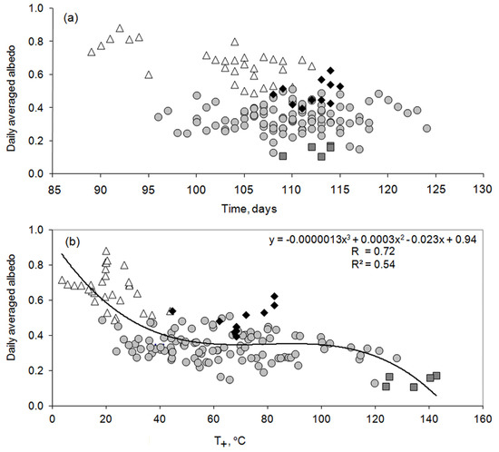 The obtained equations based on the average daily data do not take into account the daily variability of albedo and its spatial heterogeneity. They should be considered in numerical models with a time step of less than one day [23]. To improve albedo estimations, we plan to establish its dependence on a set of meteorological characteristics controlling the heat fluxes and the heat balance (air temperature, wind, humidity, cloudiness).
