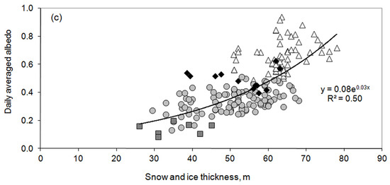We also showed the relation between the daily averaged albedo and snow-ice cover thickness (Figure 7c). This relationship is best described with an exponential dependence of the daily albedo average (A) over the full snow-ice thickness (SI):
