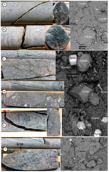 Mineral coating descriptions. Photos of the drill core samples are on the left, including a separate photo of the sampled fracture surface. Backscattered SEM images are on the right-hand side. (a) KFM08D:677 m; subhedral coating of calcite on a chlorite-rich fracture coating. (b) KFM24:193; subhedral coating of calcite on a chlorite-rich fracture coating. (c) KFM24:379; euhedral pyrite (cubic with rounded edges) and calcite (equant) on euhedral quartz. (d) KFM24:396; euhedral calcite and pyrite on a coating of euhedral quartz. Calcite habit is scalenohedral, with relatively small c-axis to a-axes ratio, and obtuse crystal tip termination. Bright euhedral bastnäsite crystals occur on the calcite surface. (e) KFM24:399; intergrown K-feldspar (adularia, partly altered) and cubic pyrite on top and partly intergrown with euhedral quartz. (f) KFM24:410 m; subhedral calcite coating with scattered intergrown pyrite crystals.