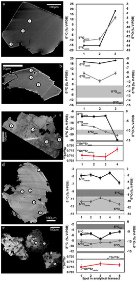 Microanalytical transects within calcite. Backscattered SEM images of polished crystal cross sections are shown to the left, with spot locations indicated (for closely spaced 10 µm δ13C and δ18O SIMS spots and in (c,e) also for subsequent 80 µm 87Sr/86Sr LA-MC-ICP-MS spots). Corresponding isotopic values are shown on the graphs. Spans of calculated values for hypothetical calcite are also shown, and are based on the groundwater composition in the same section. For this comparison, temperature dependent fractionation factors for calcite precipitation at ambient temperatures are used for δ13C [62] and δ18O [63]. Due to the geothermal gradient, the deeper borehole sections (>500 m) have been assigned a larger temperature span (5–20 °C) than the shallower samples (~0–500 m; 5–15 °C). The lower temperature limit of 5 °C includes the possibility of rapid infiltration of glacial water to a great depth. Specific features include (a) spatiotemporal intracrystal variation in δ13C and δ18O values in sample KFM24:379. Both values increase substantially in the rim of the crystal compared to the crystal core. No groundwater data exists from this fracture, but the 15 m deeper section show hypothetical calcite δ18O values of −12 to −9.6‰V-PDB (Vienna Pee Dee Belemnite) that are neither corresponding to the rim nor to the core of the crystal. (b) 13C-enrichment throughout the crystal. The δ18O and δ13C values of the calcite are higher than the values calculated from the groundwater (KFM24:193). (c) Example of substantial 13C-depleted calcite, in this case, in the outermost rim of the crystal (KFM24:399, same feature exists in e.g., KFM24:410). The value of the calcite crystal rim neither has δ18O nor 87Sr/86Sr in equilibrium with the groundwater, although the outer part has elevated 87Sr/86Sr compared to the rest of the crystal. Similar δ18O and 87Sr/86Sr discrepancy between calcite and water occurs in KFM24:414 and KFM01D:431. (d) Calcite with moderate 13C-depletion (not in equilibrium with δ13CDIC) and δ18O values in correspondence with the groundwater (KFM08D:678, similar features occur in KFM24:413 and KFM24:194). (e) Aggregate of fine-grained crystals showing zonation (KFM08D:677). Microanalyses targeting the different crystal zones show overall correspondence of δ18O with the groundwater. By contrast, both δ13C and 87Sr/86Sr are overall higher in the groundwater than in calcite.
