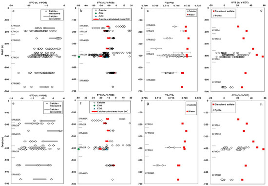 The correlation between isotopic signatures of the outermost mineral growth zones and the waters in some of the sections means that Quaternary precipitation cannot be completely ruled out. The best candidates are around 400 m depth in KFM24, where there are overlaps in 87Sr/86Sr between calcite and water, corresponding to δ18O and heavy δ34S values, both in the outermost growth zones of pyrite crystals and in the dissolved sulfate. Additional indications of relatively recent microbial activity are the remains of carbonaceous matter on the fracture surfaces here. However, overall, it can be concluded that most of the calcite formation is pre-Quaternary, and at least in the inner parts of the crystals, most likely can be linked to Paleozoic and Mesozoic precipitation events, which have been documented in other parts of the Forsmark area [29,39], and by our single Rb–Sr dating (Figure 7). Microbial activity has apparently been active over several hundred million years in this area. Extensive mineral precipitation related to microbial activity has, however, been episodic in nature.