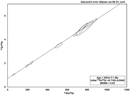 The secondary adularia–calcite assemblage in sample KFM24:399 gave an age of 396 ± 7 Ma (Figure 6, isotopic ratios in Table S8). The isochron consisted of nine adularia spots and a calcite spot for initial 87Sr/86Sr. The isochron gave a mean square weighted deviation (MSWD) of 0.52 and a probability of fit of 0.84 (maximum = 1).