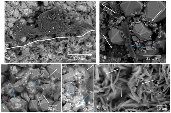 Carbonaceous matter as biofilms on, and incorporated in, minerals from sample KFM24:398. (A) A biofilm with characteristic “sheet-like” appearance. The top part is carbonaceous, and the lower part mineralized. The dashed line marks the transition from carbonaceous to mineralized portions of the biofilm. The appearance of the carbonaceous material (CM) is characterized by dark, patchy areas slightly stretched in the margins. (B) Abundant CM in between calcite and quartz crystals. The CM is partly mineralized (marked with white arrows). Remnant of associated putative fungal hyphae is marked by blue arrow. (C,D) CM with typical elongated and stretched appearance distributed on and in between calcite and quartz crystals, marked with white arrows. The CM has acted as nucleation site for mineralization, marked with blue arrows. (E) CM, as part of clay lining the sheet-like crystal lattice and voids in between the sheets as a dark patchy substance, marked by white arrows.