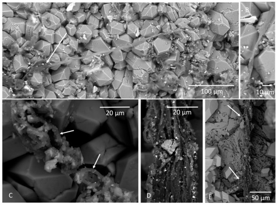 Samples KFM24:379 and 399 featured abundant carbonaceous material (CM) on mineral surfaces, incorporated in between calcite crystals and as components in clay minerals (Figure 7). The CM occurred as biofilm-like sheets (Figure 7A), carbonaceous or partly mineralized by clay in nature (Figure 7B–D). Transitions between carbonaceous portions and mineralized portions were visible (Figure 7A,C,D), and it is evident that the CM has acted as nucleation sites for mineral growth including clay, oxides, calcite, and other Si-rich phases. The CM also occurred in between crystals and as a dominant constituent in clay-like phases in between calcite crystals, thus, CM was an integrated substance of the vein mineralogy (Figure 7E).